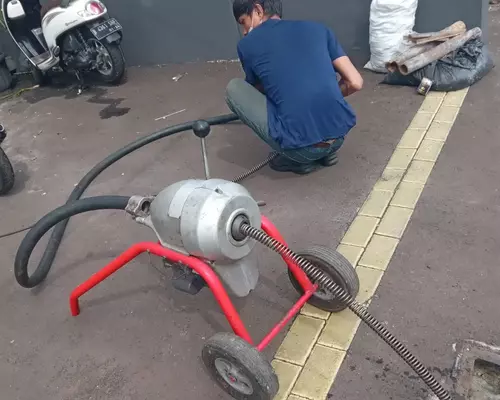 Membersihkan saluran pipa mampet dengan spiral fleksibel hingga panjang 15 meter yang dilengkapi dengan berbagai macam mata bor